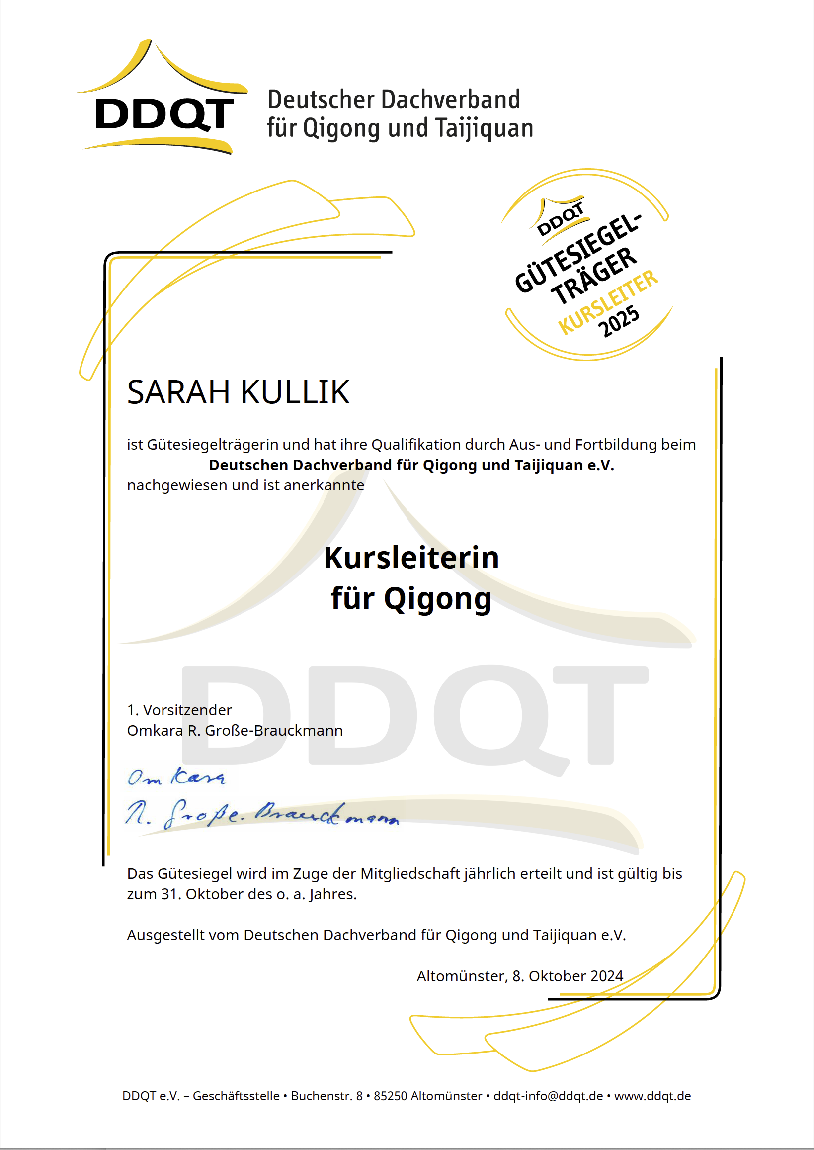 Zertifikat des DDQT (Deutscher Dachverband für Qigong und Taijiquan) als Kurlseiterin für Qigong für Sarah Kullik